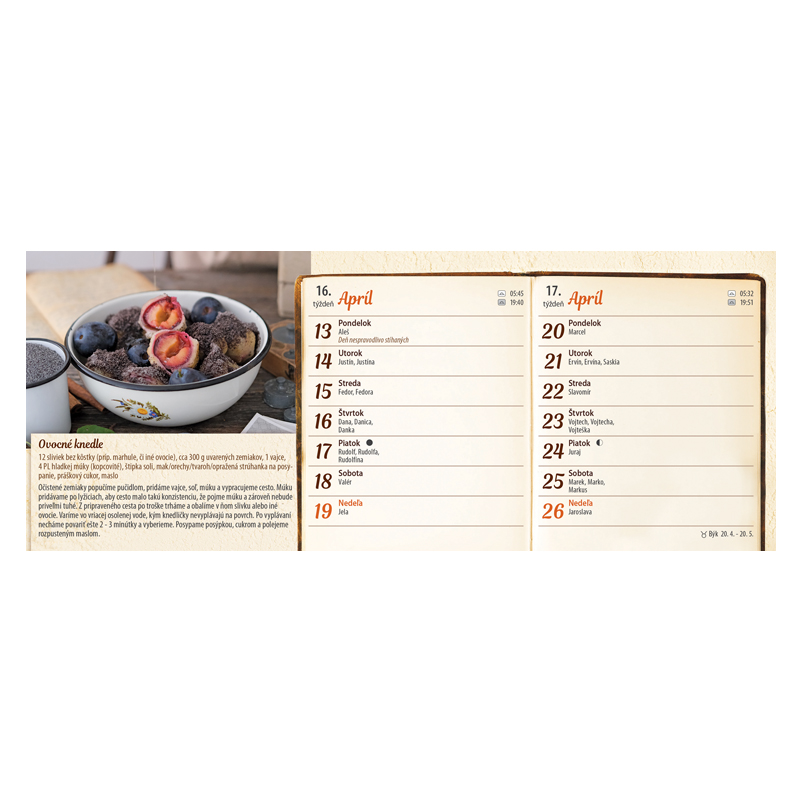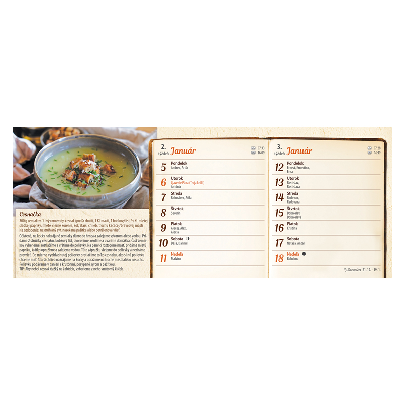 Okrem receptov kalendár ponúka slovenské štátne sviatky a pamätné dni školské prázdniny východy a západy Slnka fázy mesiaca a znamenia zverokruhu